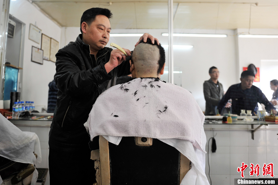 2013年03月13日是农历二月初二,中国传统民俗有着“二月二 剃龙头”的习俗,民间认为这天剃头意味着新年新气象,一定会带来好运。图为3月13日,在传统理发店“剃龙头”的昆明市民。中新社发 刘冉阳 摄