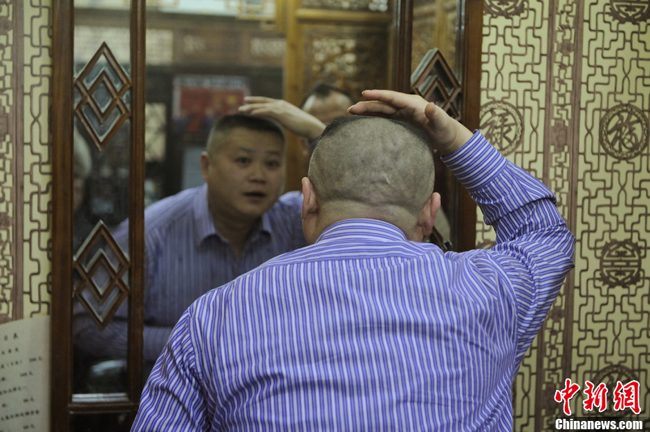 2013年03月13日是农历二月初二,中国传统民俗有着“二月二 剃龙头”的习俗,民间认为这天剃头意味着新年新气象,一定会带来好运。图为北京一家名为“金板寸”的老字号理发店,清早便开始有市民陆续排队剃头。北京市民在整理自己的头发。中新社发 崔楠 摄