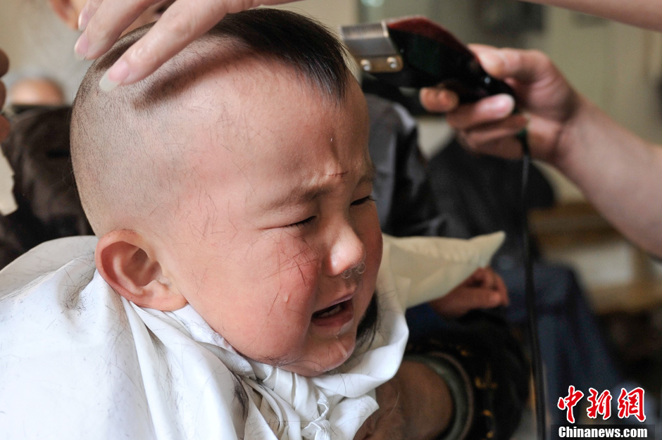 2013年03月13日是农历二月初二,中国传统民俗有着“二月二 剃龙头”的习俗,民间认为这天剃头意味着新年新气象,一定会带来好运。图为3月13日,昆明一理发师给小宝宝“剃龙头”,孩子委屈地哭了起来。中新社发 刘冉阳 摄