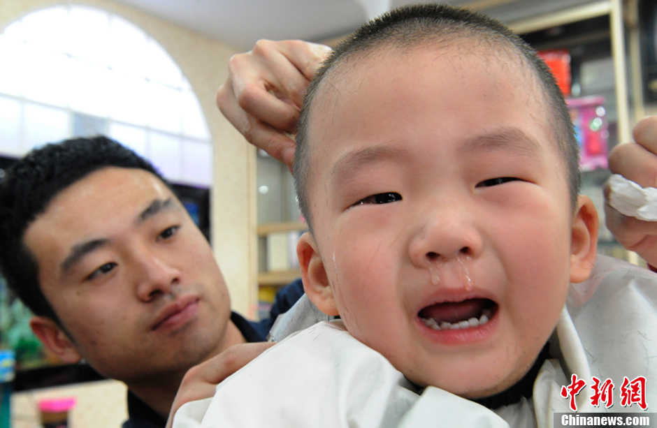 3月13日是中国农历“二月初二”,民间素有“剪龙头”的习俗,很多人在这一天都来到理发店剪头,给自己讨个好彩头。图为长春市一家儿童美发店内,一个19个月大的小男孩不喜欢理发,在不停地哭闹。张瑶 摄
