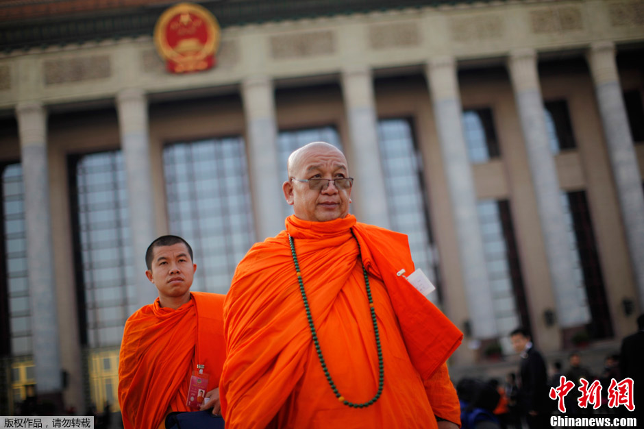 3月3日,一名佛教委员在开完会后离开大会堂。当日,全国政协十二届一次会议开幕。