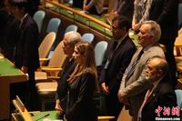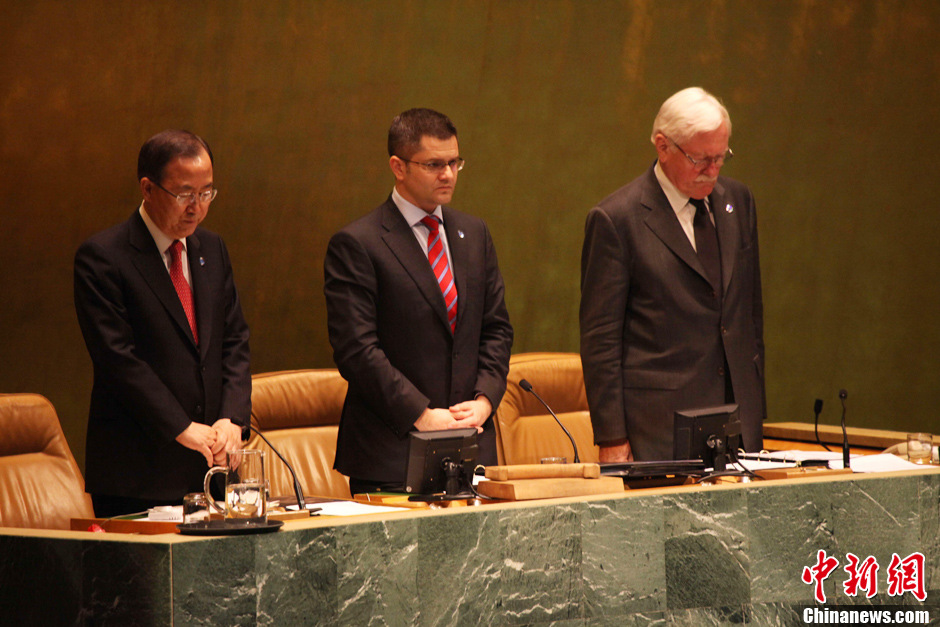 当地时间3月13日,联合国举行特别会议哀悼委内瑞拉已故总统查韦斯。联合国秘书长潘基文、第67届联大主席耶雷米奇等在联大会场默哀。中新社发 李洋 摄