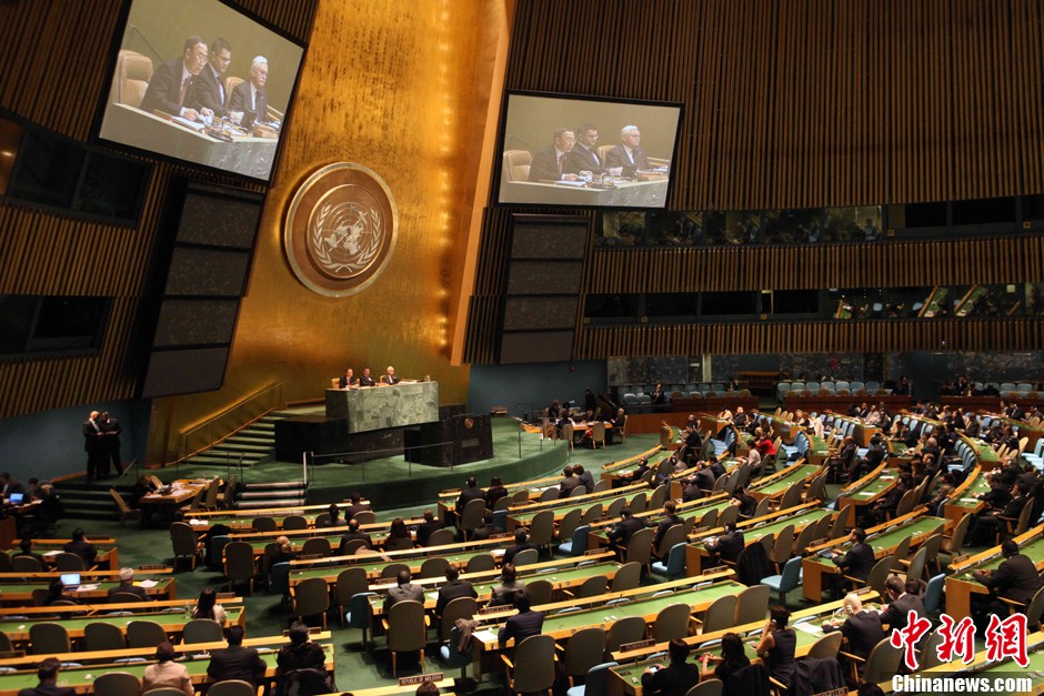 当地时间3月13日,联合国举行特别会议哀悼委内瑞拉已故总统查韦斯。图为悼念活动现场,联合国秘书长潘基文对查韦斯给予较高评价。中新社发 李洋 摄