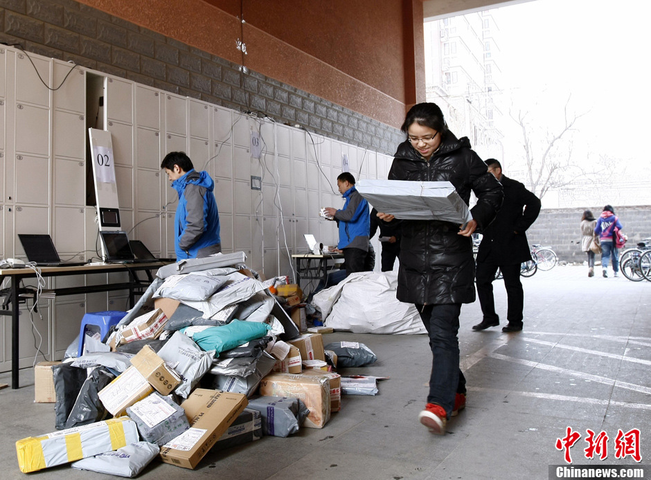 3月14日,中国人民大学校内,一名学生刚刚利用自助取快递的方式取走了快件。近日,中国人民大学启用了全自助式“智能快递柜”,率先在高校中实现了校内快递派送集中统一管理。据悉,这种“智能快递柜”是一种快递自助取件的新方式,工作人员将每天收到的快递放入快递柜中,并以短信方式将取件密码和取件方式发送给收件人,收取快递的人只需要输入服务商发来的密码,即可拿到快递。中新社发 李慧思 摄