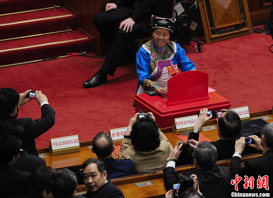 3月14日上午,第十二届全国人民代表大会第一次会议在北京人民大会堂举行第四次全体会议,图为少数民族代表正在投票。中新社发 侯宇 摄