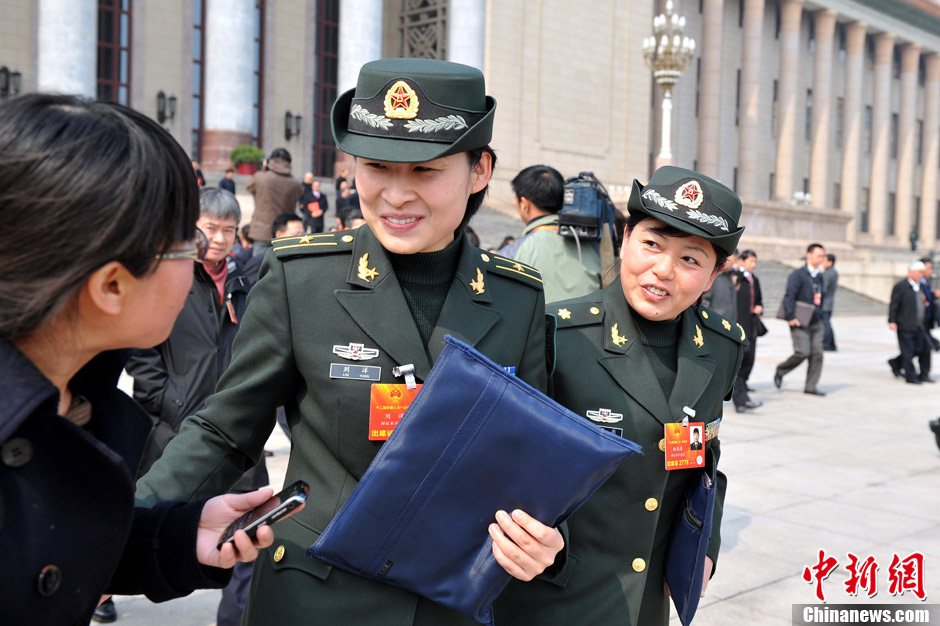 3月14日上午,十二届全国人大一次会议在北京人民大会堂举行第四次全体会议。会议结束后,来自解放军代表团的中国首位女航天员刘洋步出会场,微笑婉拒媒体采访。中新社发 刘占昆 摄