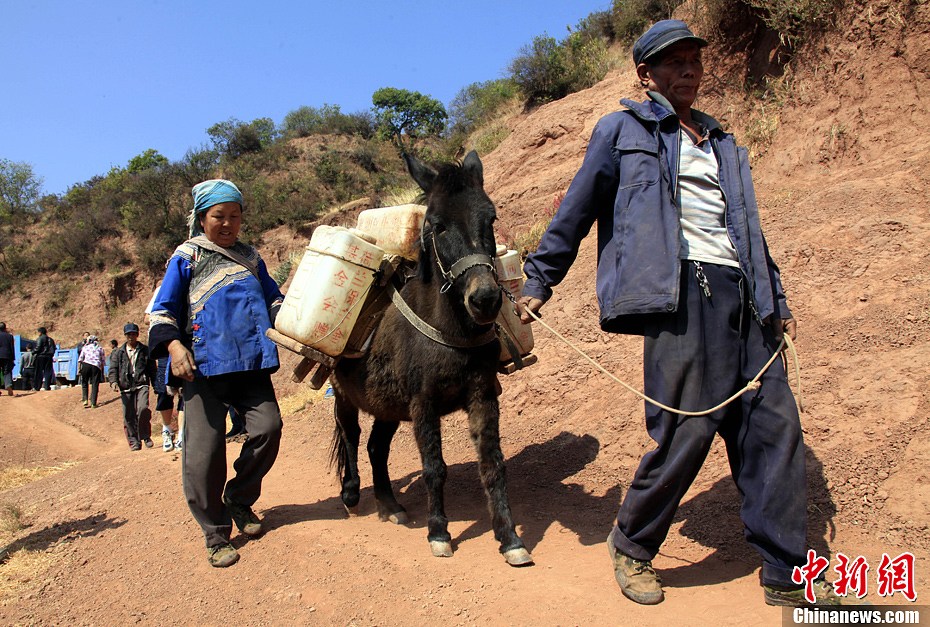 3月14日,云南元谋县姜驿乡席草地村,一位空巢家庭的傈僳族老两口用家中养的骡子作运输工具,驮运当地政府送到村头的饮用水回家。据介绍,云南迄今已连续4年干旱,灾情严重。中国红十字基金会为此在当地开展“天使之旅——春雨行动”,组织志愿者前往重灾区进行入户灾情调查。孙自法 摄
