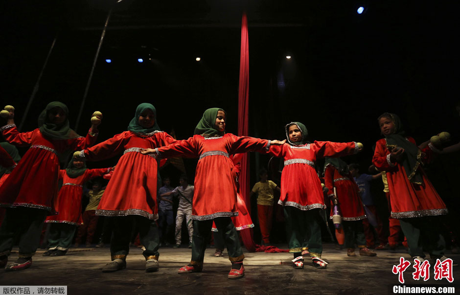 当地时间3月13日,阿富汗喀布尔,来自移动迷你儿童马戏团的孩子参加表演。