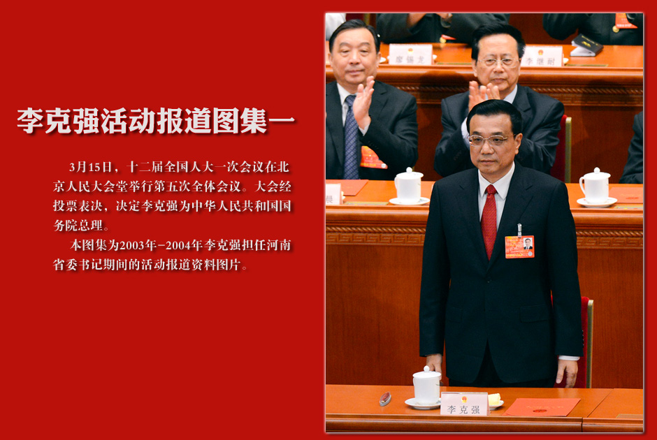 3月15日,十二届全国人大一次会议在北京人民大会堂举行第五次全体会议。大会经投票表决,决定李克强为中华人民共和国国务院总理。本图集为2003年-2004年李克强担任河南省委书记期间的活动报道资料图片。