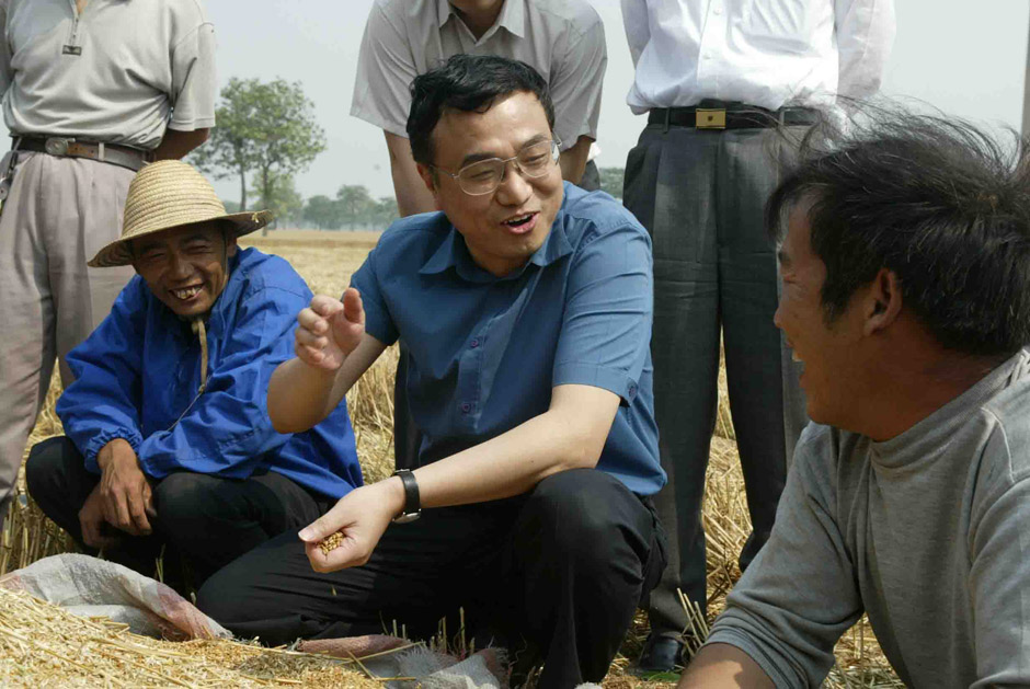 2003年6月4日,李克强在河南鹤壁市调研。图为李克强在淇县桥盟乡七里堡村的麦田里向当地农民了解麦收情况。史家民 摄