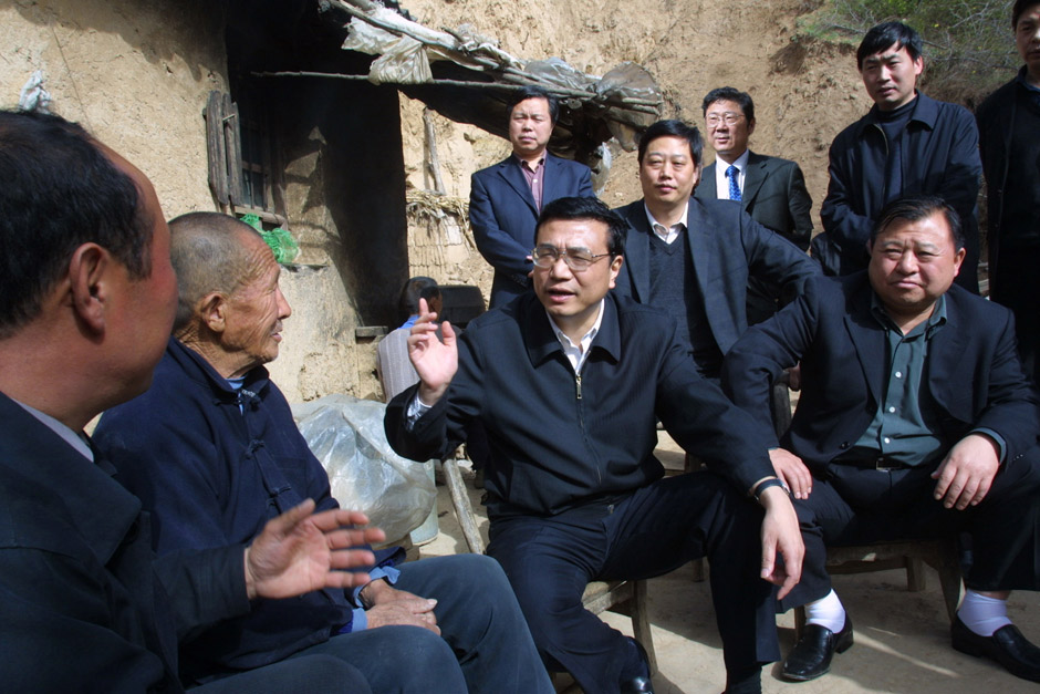 2004年4月1日,李克强在河南卢氏县官道口镇秋凉河村和杜关镇窑峪村分别看望慰问了贫困户,这是在秋凉河村老党员彭小谋家中。陈伟 摄