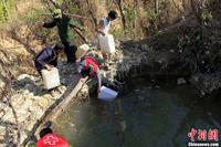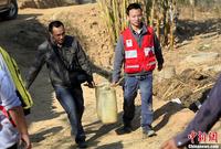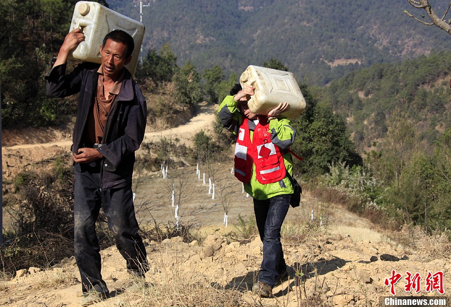 3月15日,云南楚雄州永仁县中和镇乌龟塘村,一位志愿者(后)帮助当地村民扛着一桶从山下池塘取的水上山装骡车运回家。据介绍,云南迄今已连续4年干旱,灾情严重。中国红十字基金会为此在当地开展“天使之旅——春雨行动”,组织志愿者前往重灾区进行入户灾情调查。孙自法 摄