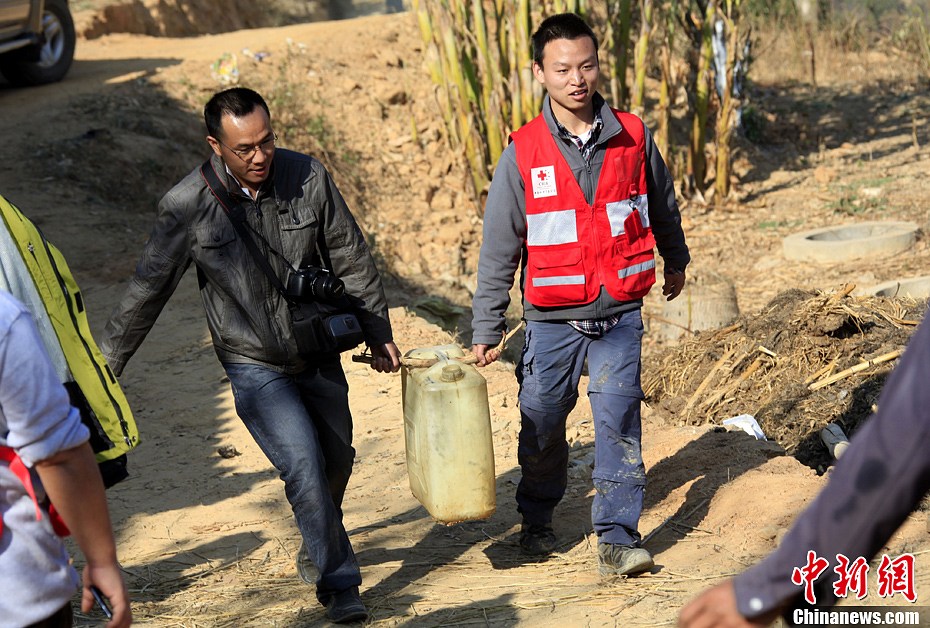 3月15日,云南楚雄州永仁县中和镇乌龟塘村,一位志愿者和当地政府官员帮助村民从山下抬回一桶水上山准备运骡车。据介绍,云南迄今已连续4年干旱,灾情严重。中国红十字基金会为此在当地开展“天使之旅——春雨行动”,组织志愿者前往重灾区进行入户灾情调查。孙自法 摄