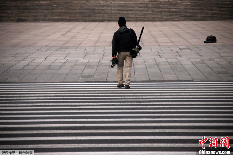 3月15日,一名背着摄影设备的记者走在人民大会堂外。