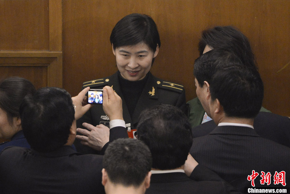 3月15日上午,十二届全国人大一次会议在人民大会堂举行第五次全体会议。图为代表争相找刘洋合影。中新社发 廖攀 摄