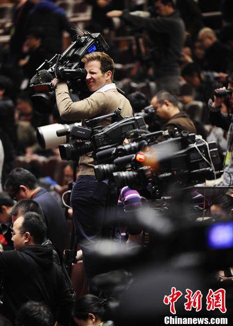 3月15日上午,十二届全国人大一次会议在北京人民大会堂举行第五次全体会议。图为一名外国摄像记者正在拍摄。中新社发 侯宇 摄
