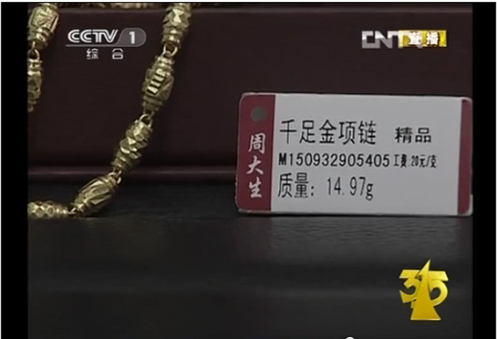 3月15日,2013年央视315晚会举行。央视3.15晚会曝光了黄金行业乱象,所谓的千足金,很多都没达标,而是添加了另一种元素,叫做“铱”。铱在化学元素周期表当中与黄金紧挨着,它的密度与黄金非常地相似,但它的价格是黄金的五到十分之一。有的厂家就把这个铱掺杂到黄金当中,做成首饰来卖给消费者,周大生等品牌均涉及。图片来源:央视网