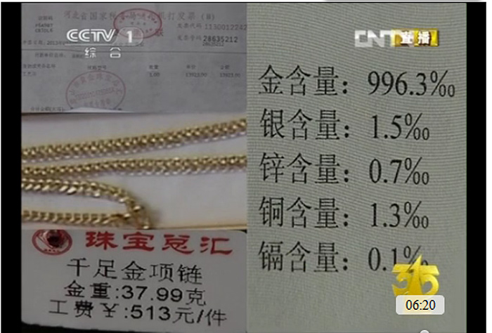 3月15日,2013年央视315晚会举行。央视3.15晚会曝光了黄金行业乱象,所谓的千足金,很多都没达标,而是添加了另一种元素,叫做“铱”。铱在化学元素周期表当中与黄金紧挨着,它的密度与黄金非常地相似,但它的价格是黄金的五到十分之一。有的厂家就把这个铱掺杂到黄金当中,做成首饰来卖给消费者,周大生等品牌均涉及。图片来源:央视网
