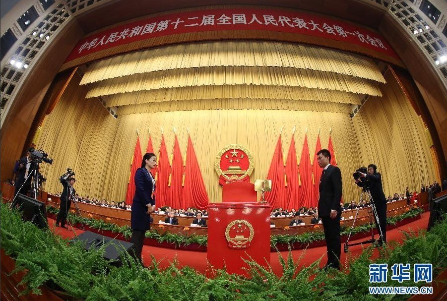 3月16日,十二届全国人大一次会议在北京人民大会堂举行第六次全体会议。图为监票人在票箱旁就位。庞兴雷 摄 图片来源:新华网