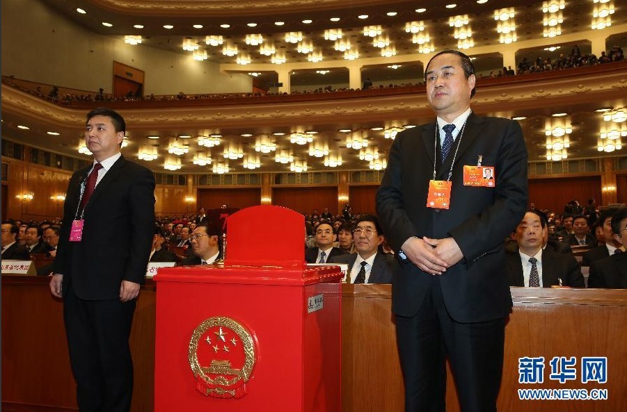 3月16日,十二届全国人大一次会议在北京人民大会堂举行第六次全体会议。图为监票人(右)在投票箱旁就位。 陈建力 摄 图片来源:新华网