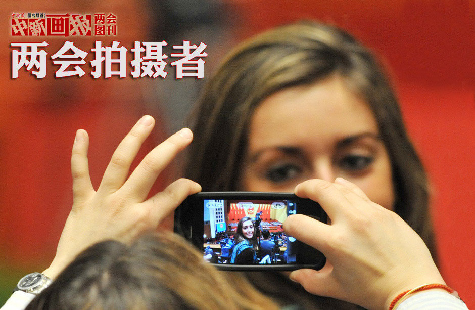 全国两会召开期间,无处不摄影,无事不记录,印证着百闻不如一见的视觉至理。图为记者席里的外国摄影师双姝见证中国现场。中新社发 贾国荣 摄