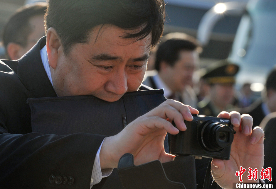 全国两会召开期间,无处不摄影,无事不记录,印证着百闻不如一见的视觉至理。图为一名代表口咬文件包,双手不失时机地稳住拍照。中新社发 贾国荣 摄