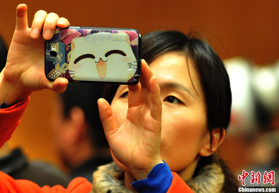 全国两会召开期间,无处不摄影,无事不记录,印证着百闻不如一见的视觉至理。图为女记者指尖上展现手机宠物图。中新社发 贾国荣 摄