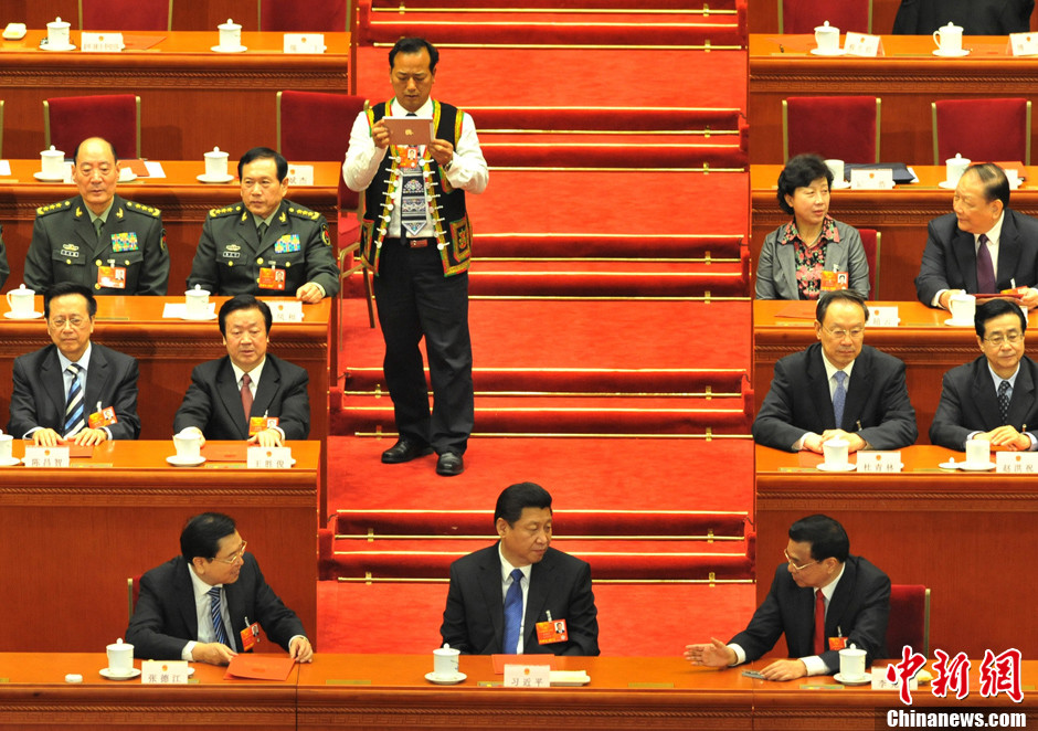 全国两会召开期间,无处不摄影,无事不记录,印证着百闻不如一见的视觉至理。图为主席台上的一位少数民族代表占尽天时地利人和。中新社发 贾国荣 摄