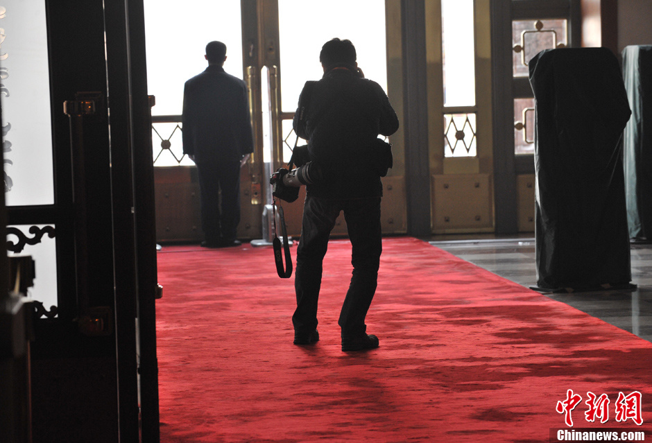 全国两会召开期间,无处不摄影,无事不记录,印证着百闻不如一见的视觉至理。图为一名善于观察的摄影记者,镜头对准门厅守卫的背影。中新社发 贾国荣 摄