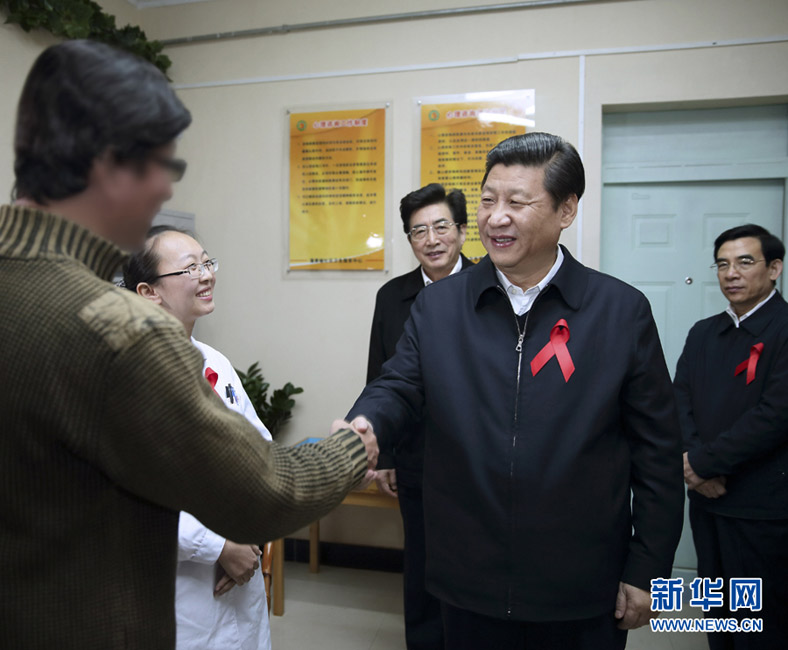 2012年11月30日,习近平在北京市参加世界艾滋病日活动,与艾滋病感染者握手交谈。兰红光 摄 图片来源:新华网