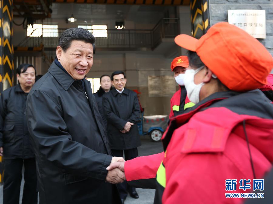 2013年2月8日,习近平到北京市西城区手帕口清洁站看望慰问春节期间坚守岗位的环卫工人。刘卫兵 摄 图片来源:新华网