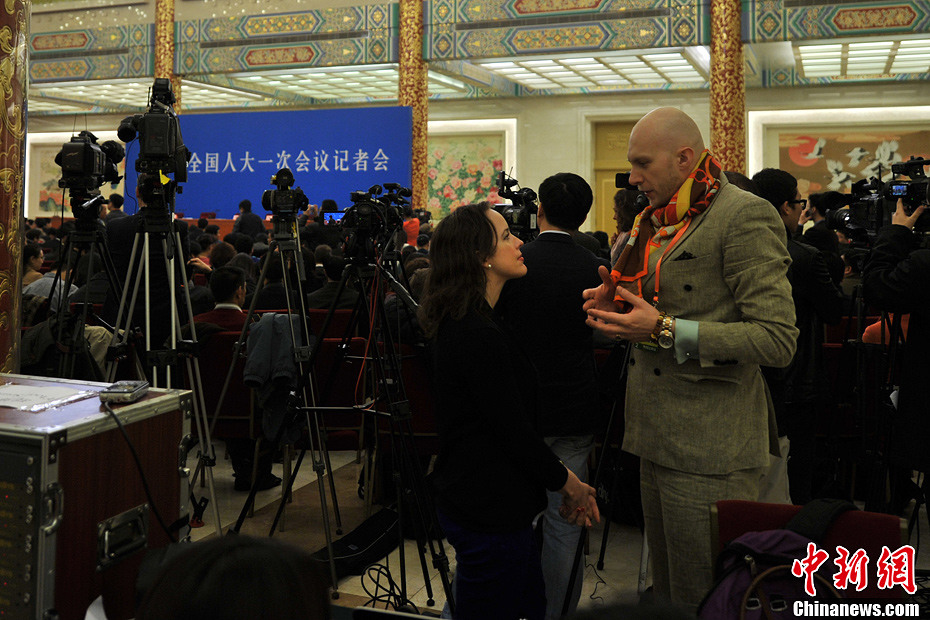 十二届全国人大一次会议于17日闭幕。大会闭幕后,新任国务院总理李克强将进行自己的首场“总理记者会”,记者在清晨5点就开始排队准备入场。图为记者在人民大会堂准备对总理记者会进行直播。中新网记者 金硕 摄
