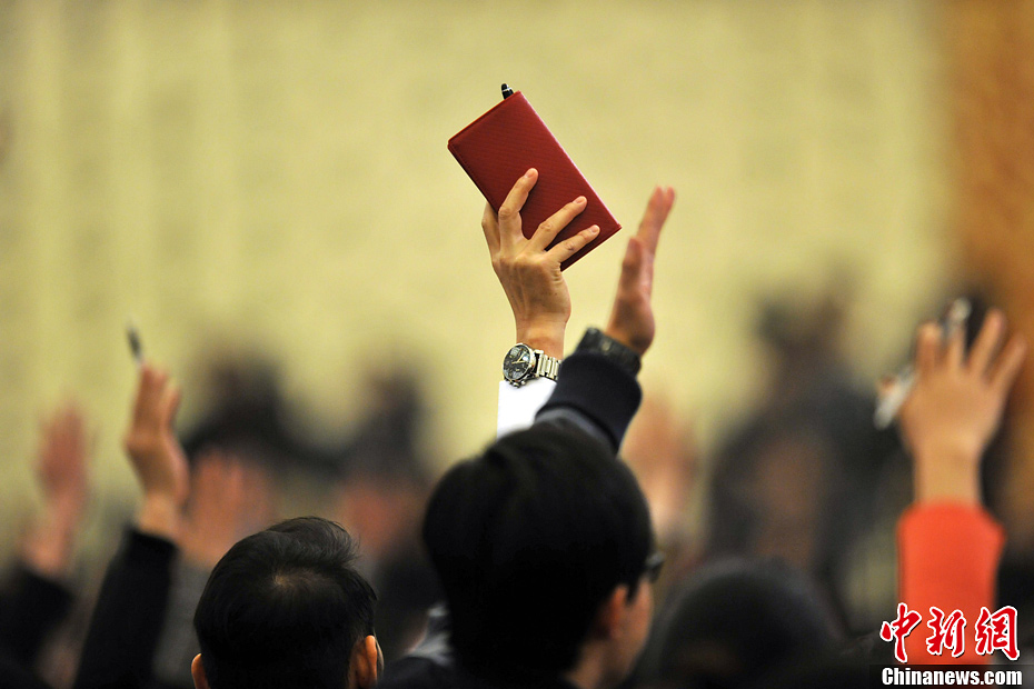 3月17日上午,十二届全国人大一次会议闭幕后,国务院总理李克强在人民大会堂三楼金色大厅会见采访十二届全国人大一次会议的中外记者并回答记者提出的问题。图为记者踊跃举手提问。中新网记者 金硕 摄