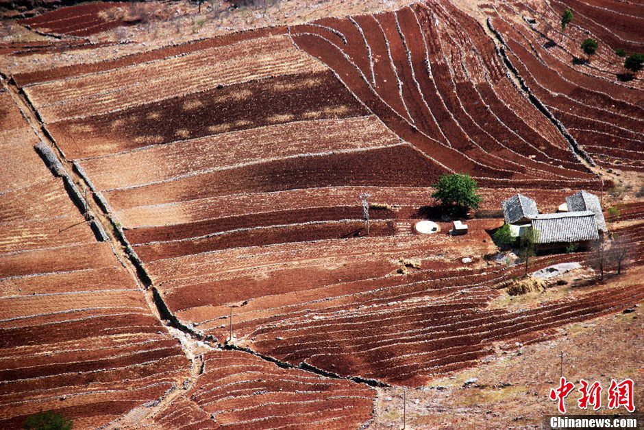 3月16日,在贵州省威宁县斗古乡中关村拍摄的一片干旱的土地。由于气温偏高,降水量少,贵州省西部毕节市、六盘水市和黔西南布依族苗族自治州等地部分县(市)发生春旱。中新社发 何欢 摄 图片来源:CNSPHOTO