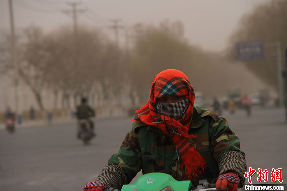 3月18日下午18时开始,地处河西走廊的甘肃古城张掖,本就不太晴朗的天空被自西北向东南刮来的沙尘搅得更加天昏地暗,此刻下班的人们在沙尘中匆匆回家。据兰州中心气象台预报,近日,甘肃省大部的天气都将维持稳定的晴好天气,但是河西五市局部仍有沙尘天气。图为 “全副武装”回家的居民。陈礼 摄