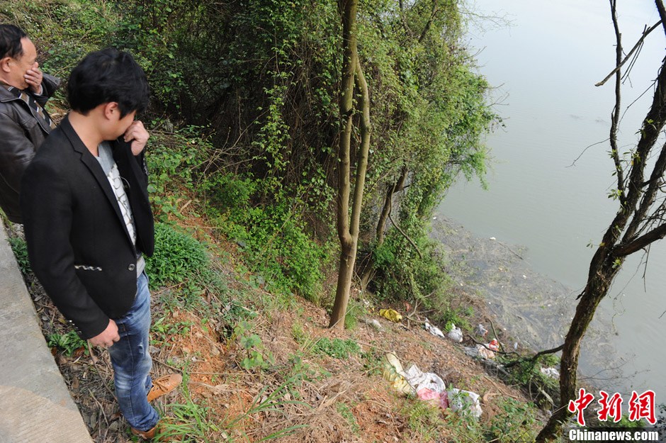 3月21日,在湖南浏阳市普迹镇内,数十头用编织袋包裹好或裸露的死猪被丢弃在浏阳河畔,腐臭味弥漫四周。据当地村民介绍,河边丢弃和漂浮的死猪现象常年存在。图为腐臭味让路人纷纷捂鼻而过。杨华峰 摄