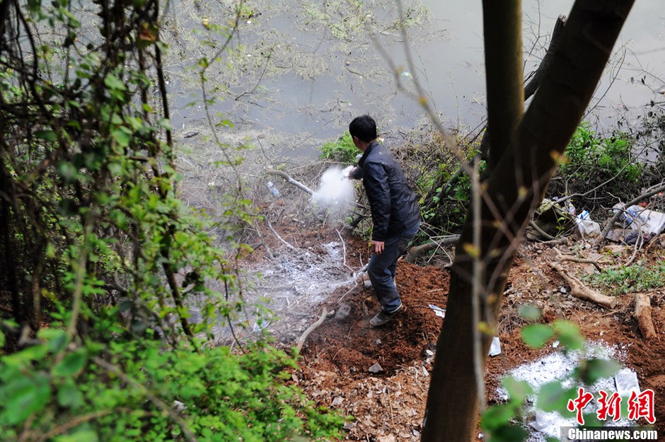 3月21日,在湖南浏阳市普迹镇内,数十头用编织袋包裹好或裸露的死猪被丢弃在浏阳河畔,腐臭味弥漫四周。据当地村民介绍,河边丢弃和漂浮的死猪现象常年存在。图为普迹镇畜牧站的工作人员将死猪就地掩埋,并且在上面撒上石灰。杨华峰 摄