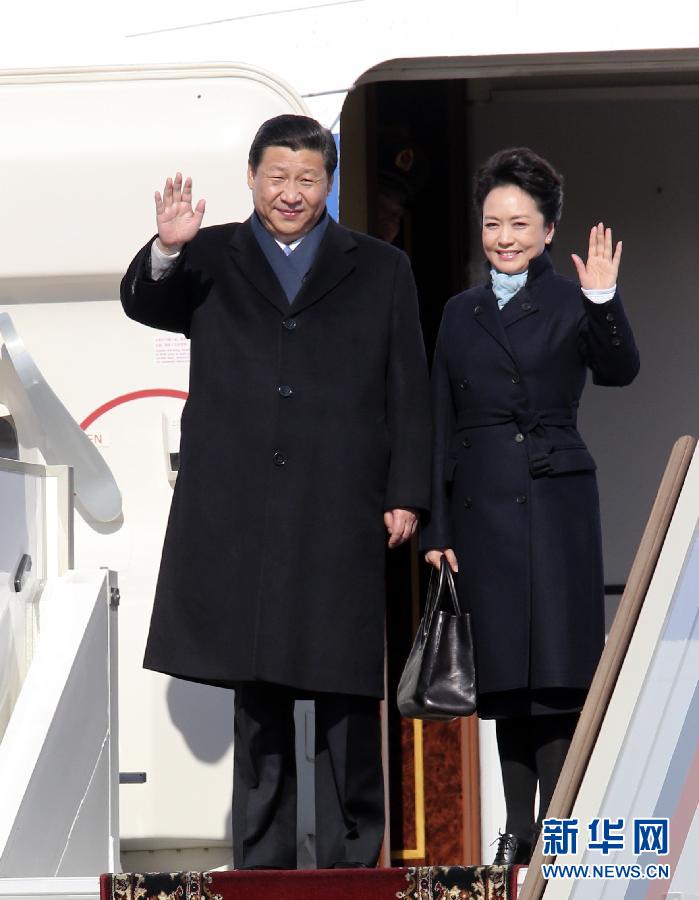 3月22日,国家主席习近平乘专机抵达莫斯科,开始对俄罗斯进行国事访问。这是习近平与夫人彭丽媛向欢迎人群挥手致意。 丁林 摄 图片来源:新华网