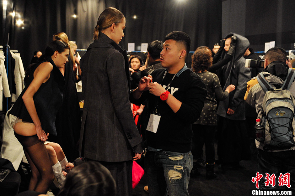 图为走秀前繁忙的更衣室。中新网记者 金硕 摄