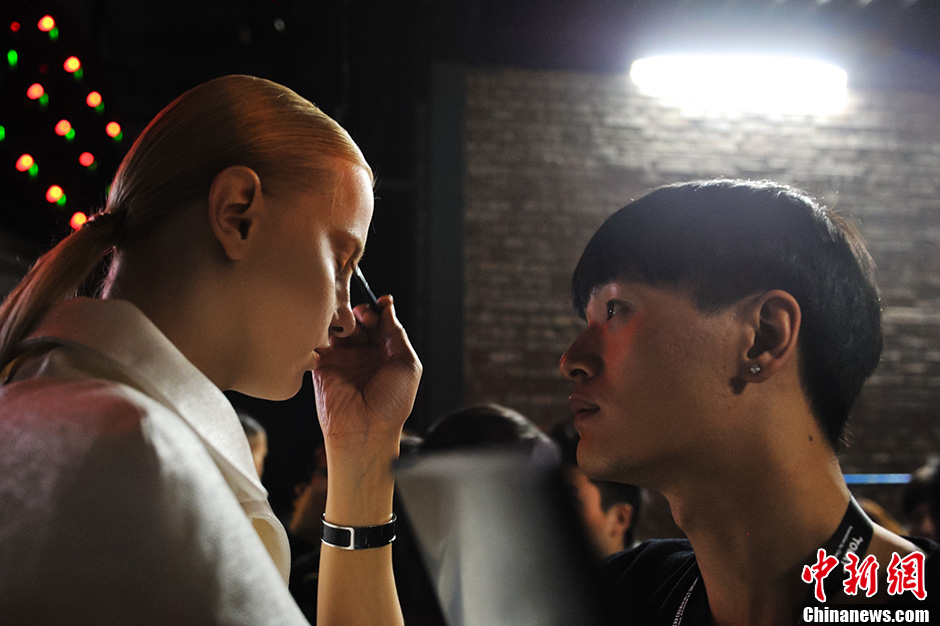 图为走秀前造型师为模特补妆。中新网记者 金硕 摄