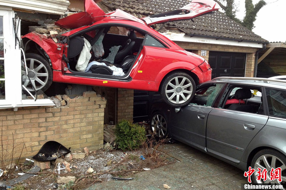 英国男子驾跑车飞撞民宅“嵌”入墙内