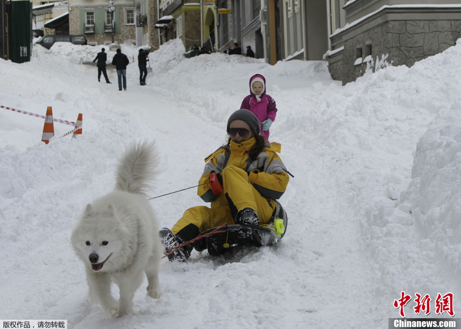 乌克兰遭大雪袭击 民众街头滑雪乐趣无穷