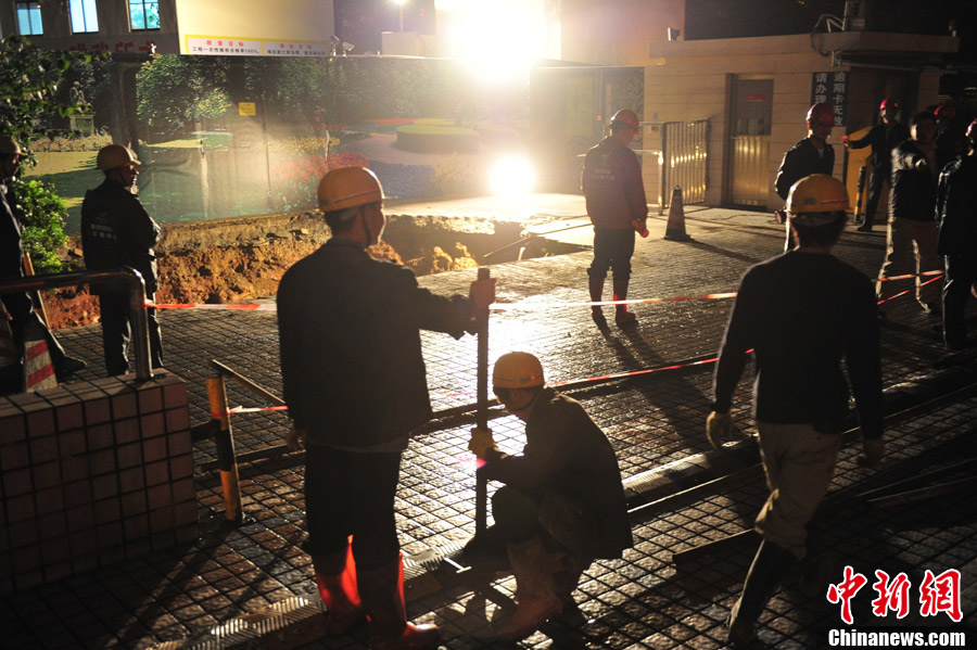 3月26日傍晚,位于深圳景洲大厦和深圳报业集团一在建工地交界处发生地陷大坑,景洲大厦小区年轻保安杨喜兵在拉警戒线时不幸坠坑遇难。中新社发 陈文 摄