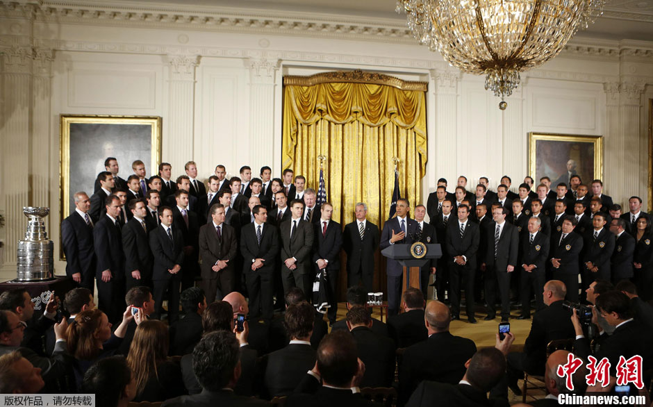 当地时间3月26日,美国首都华盛顿,美国总统奥巴马在白宫东厅接见2012年美国职业足球大联盟冠军洛杉矶银河队和2012年美国国家冰球联盟冠军洛杉矶国王队的全体成员,并发表演讲。