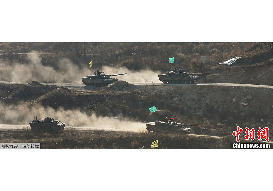 当地时间3月27日,韩国京畿道抱川训练场内韩国陆军第26师装甲部队K-1主战坦克进行了射击演练。