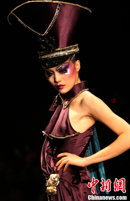 3月27日, 正在北京举行的中国国际时装周(2013/2014秋冬系列)展演上,推出MGPIN·毛戈平彩妆造型发布会,发布会主题为“战争与和平”,通过彩妆艺术作品引发人们对战争的深刻反思,传递人类对和平与品质生活的向往。图为模特展示毛戈平彩妆造型发布会作品。中新社发 钱兴强 摄