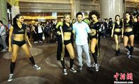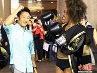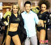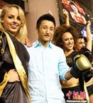 2013年3月27日,邹市明现身时代广场为即将举行的黄金拳赛造势,与举牌女郎亲密接触。图片来源:Osports全体育图片社