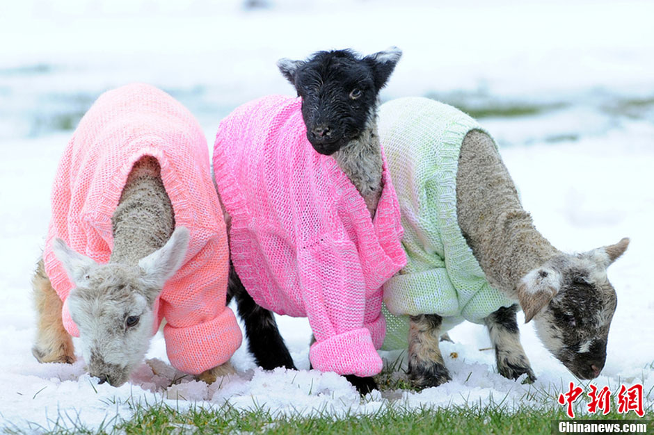 英国遭遇最冷春天 羊羔穿上羊毛外套