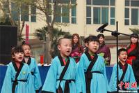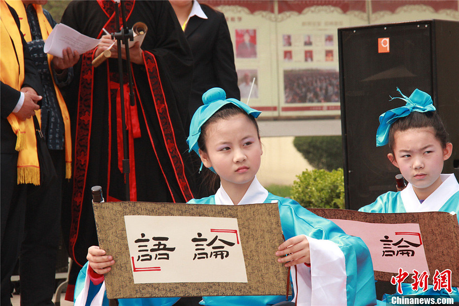 31日,西安多所高校的大学生、传统文化爱好者及社会人士500余人,举办癸巳清明祭孔仪式,诵读国学经典,弘扬传统文化,表达对孔子的崇敬之情。图为朗诵《论语》的孩童。冀浩凡 摄
