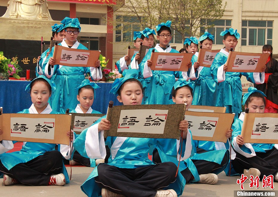 31日,西安多所高校的大学生、传统文化爱好者及社会人士500余人,举办癸巳清明祭孔仪式,诵读国学经典,弘扬传统文化,表达对孔子的崇敬之情。图为小学生朗诵《论语》。冀浩凡 摄